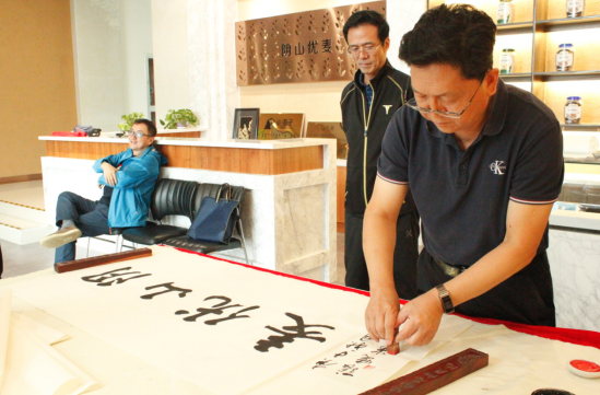 隨后,大家又來到燕麥博物館,感受燕麥文化、體驗(yàn)燕麥產(chǎn)品的同時,并現(xiàn)場目睹書法名家張曉華老師的揮毫潑墨。孟才介紹,中國燕麥的市場份額在100億元以上,裸燕麥起源于中國,但是國內(nèi)燕麥深加工所用的原糧90%是進(jìn)口皮燕麥,只有10%是國產(chǎn)裸燕麥,主要原因是國產(chǎn)裸燕麥多采用傳統(tǒng)旱作耕作方式,人工除草,有機(jī)種植,不使用除草劑、農(nóng)藥、化肥等,畝產(chǎn)較低。但是,也正因如此裸燕麥的口感更好、質(zhì)量更佳且蛋白質(zhì)、脂肪、β-葡聚糖等營養(yǎng)成分均高于皮燕麥。得天獨(dú)厚的資源優(yōu)勢是陰山優(yōu)麥建企立身的根基和市場競爭的底氣,產(chǎn)品全部采用優(yōu)質(zhì)的國產(chǎn)裸燕麥就是陰山優(yōu)麥的核心競爭力!