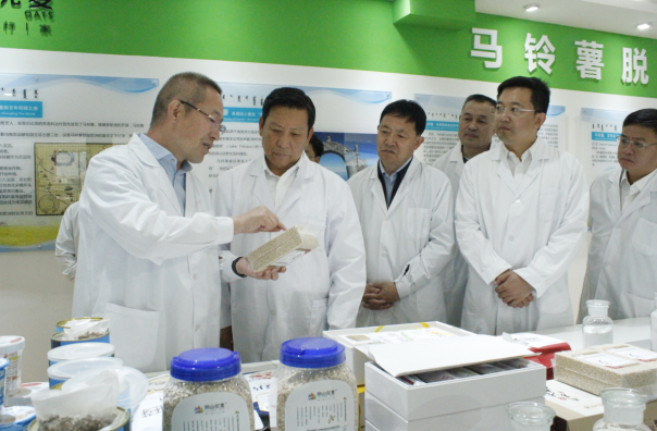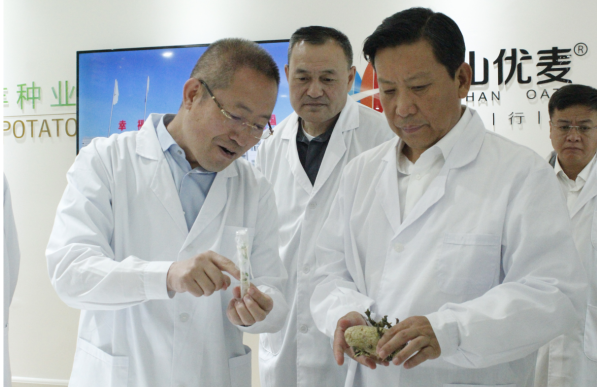 段志強(qiáng)一行首先參觀了民豐種業(yè)脫毒組培中心展廳,詳細(xì)了解了馬鈴薯脫毒種薯生產(chǎn)過程及企業(yè)發(fā)展情況。張國介紹,內(nèi)蒙古民豐種業(yè)有限公司成立于2008年,注冊資本1.3億元,已累計(jì)完成投資10億元以上,公司已發(fā)展成為集馬鈴薯種薯、訂單薯生產(chǎn)及馬鈴薯、燕麥深加工于一體的全產(chǎn)業(yè)鏈集團(tuán)化企業(yè),是“農(nóng)業(yè)產(chǎn)業(yè)化國家重點(diǎn)龍頭企業(yè)”、“國家高新技術(shù)企業(yè)”、“自治區(qū)扶貧龍頭企業(yè)”。目前,公司已發(fā)展成為一家融合農(nóng)業(yè)和食品加工業(yè)的全產(chǎn)業(yè)鏈集團(tuán)化公司,形成以食品加工帶動(dòng)農(nóng)業(yè),以農(nóng)業(yè)服務(wù)食品加工,一、二、三產(chǎn)融合、農(nóng)商互聯(lián)齊頭并進(jìn)的良性發(fā)展業(yè)務(wù)格局。