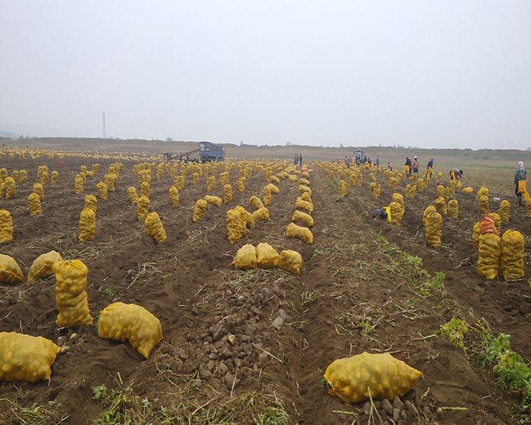 當汽車漸近農場時,遠遠望去,視野被茫茫一片黃燦燦的景色鎖定?!澳蔷褪秦S收的馬鈴薯嗎?”大家的心情隨之激動起來。車子繼續(xù)前行,一袋袋裝好的馬鈴薯展露在眼前,整齊有序,像昂首等待檢閱的士兵方陣,田間地頭充滿了收獲機的聲音和豐收的喜悅。